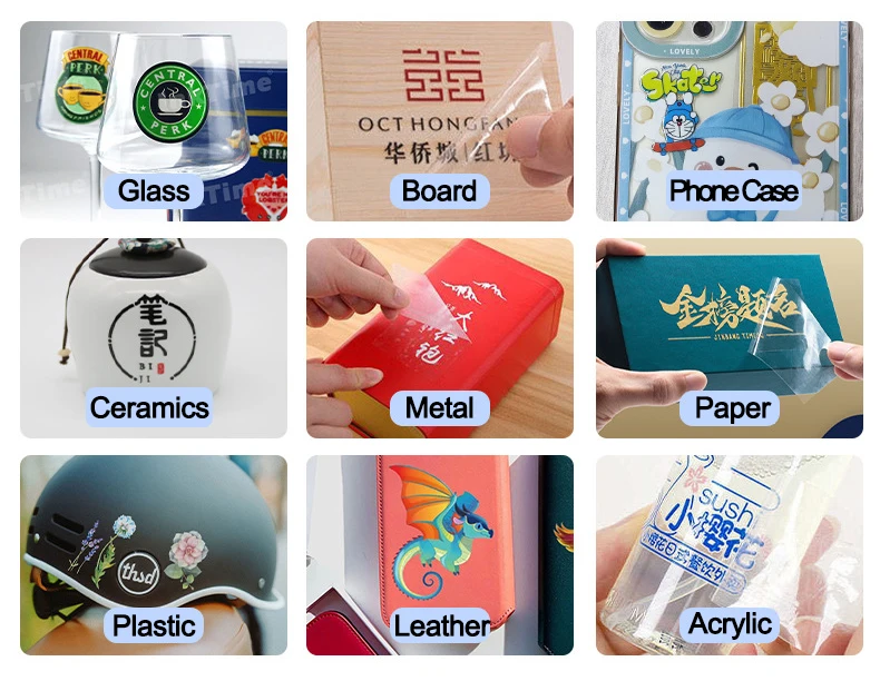 Application Materials : Wood,chrome paper,PC,PET,PVC,ABS,acrylic,plastic,leather,rubber, film,disks,glass,ceramic, metal,photo paper,stone material,etc